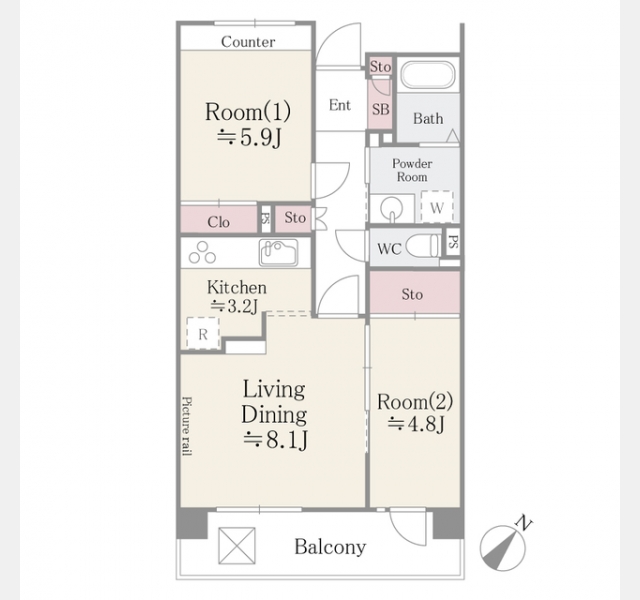| 間取り | 2DK | 専有面積 | 55.74m² | ||
